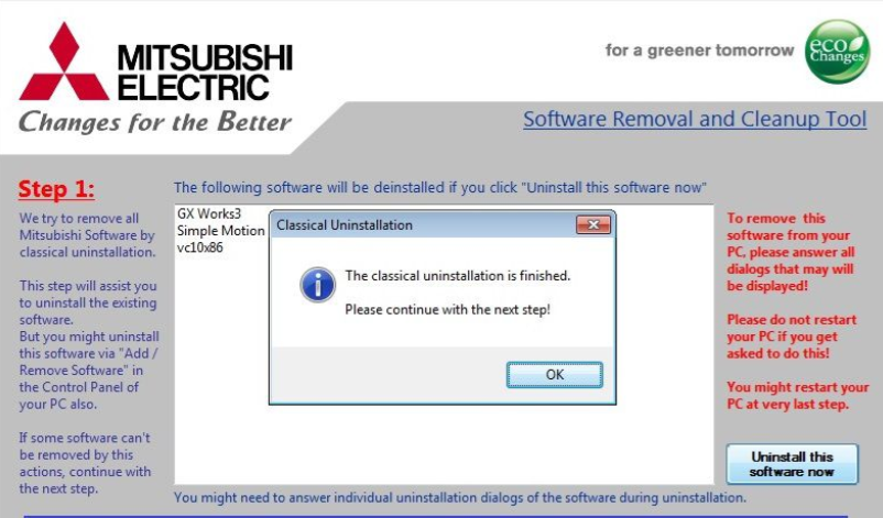 Mitsubishi Removal & CleanUp Tool is a dedicated software tool (usually technical support software) used to completely uninstall or clean the system of software, drivers, or components related to devices or software provided by Mitsubishi Electric – especially in the field of factory automation.